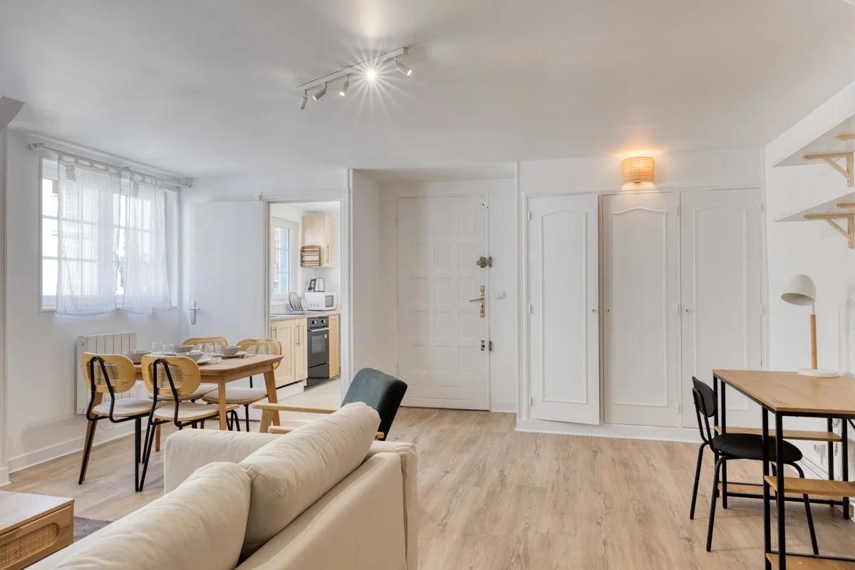 L’inspiration de l’aménagement s’est construite autour d’un élément clé conservé, la cuisine et sa teinte bois, véritable fil conducteur du projet. Ce choix a permis de structurer l’ensemble des espaces et de créer une cohérence visuelle naturelle entre les différentes zones de l’appartement. La luminosité généreuse du logement a également guidé les partis pris, avec une volonté affirmée de renforcer la sensation d’espace et de clarté.