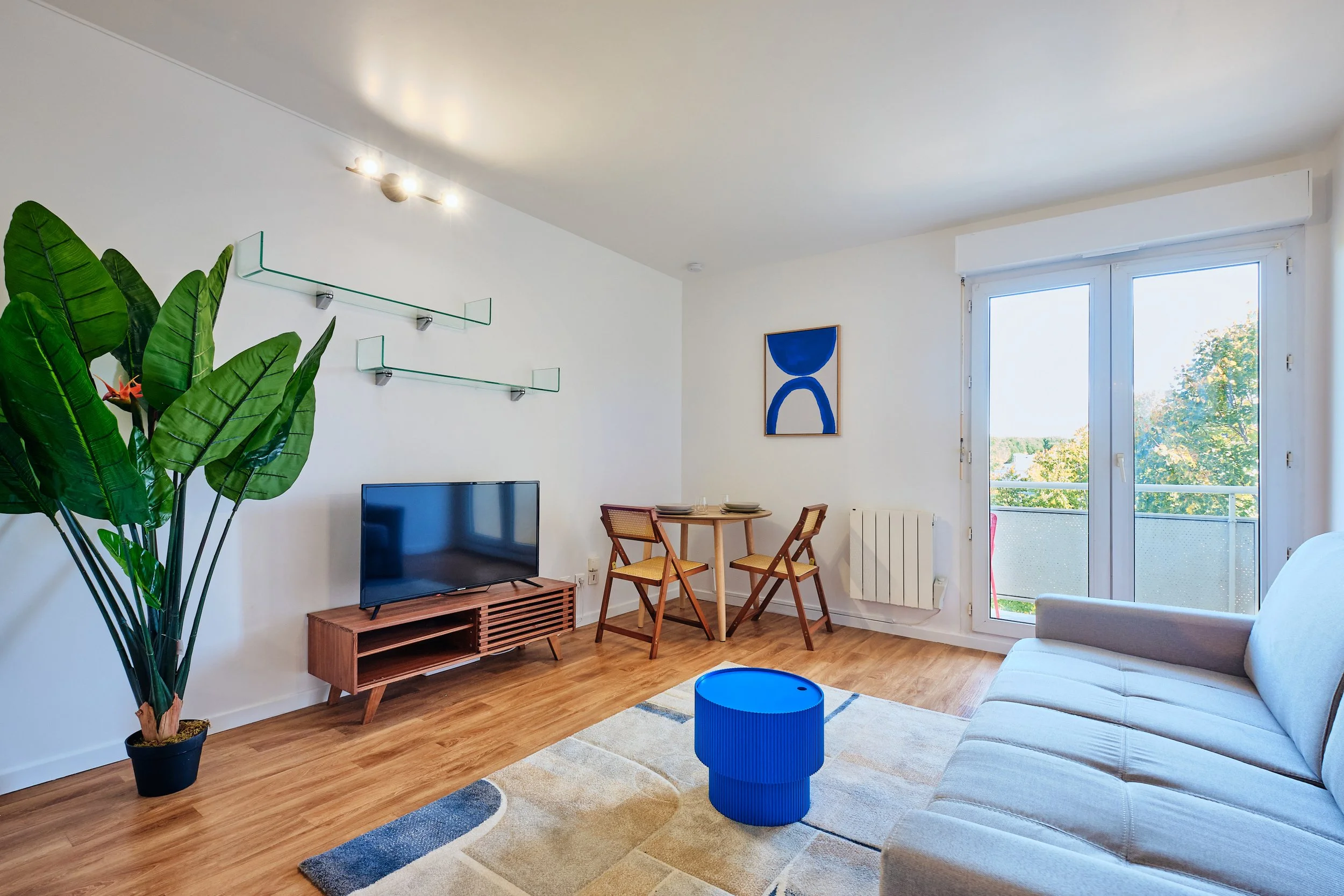 La pièce de vie, baignée de lumière grâce à de grandes ouvertures, a été réorganisée autour d’un mobilier épuré et polyvalent. Le choix d’un canapé aux lignes simples, associé à un tapis graphique et à une table basse bleue, apporte une identité contemporaine sans surcharger l’espace. Les teintes naturelles du sol et du mobilier en bois créent un contraste harmonieux avec les touches de couleur plus vives, notamment le bleu présent dans l’œuvre murale et les éléments décoratifs.